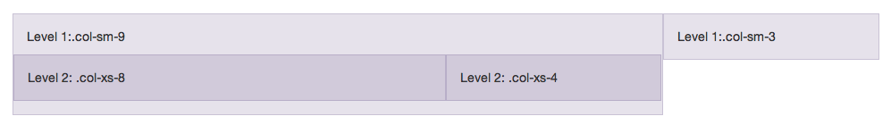 <div class="row"> <div class="col-sm-9">Level 1:.col-sm-9 <div class="row"> <div class="col-xs-8">Level 2: .col-xs-8</div> <div class="col-xs-4">Level 2: .col-xs-4</div> </div> </div> <div class="col-sm-3">Level 1:.col-sm-3</div> </div>