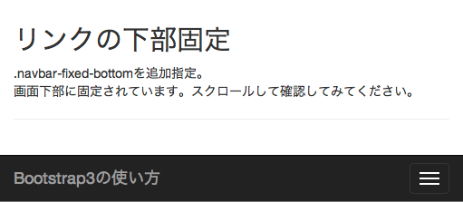 <div class="navbar-header"> <button type="button" class="navbar-toggle" data-toggle="collapse" data-target=".navbar-collapse"> ... <a href="#" class="navbar-brand">Bootstrap3の使い方</a> </div>